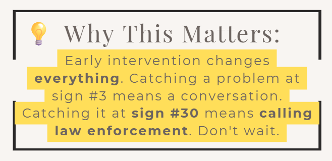 Catching a problem at warning sign #3 means you can fix it with a conversation. Catching it at warning sign #20 means you're calling the FBI. The parents who caught it early are grateful. The parents who waited are devastated. Which one will you be?