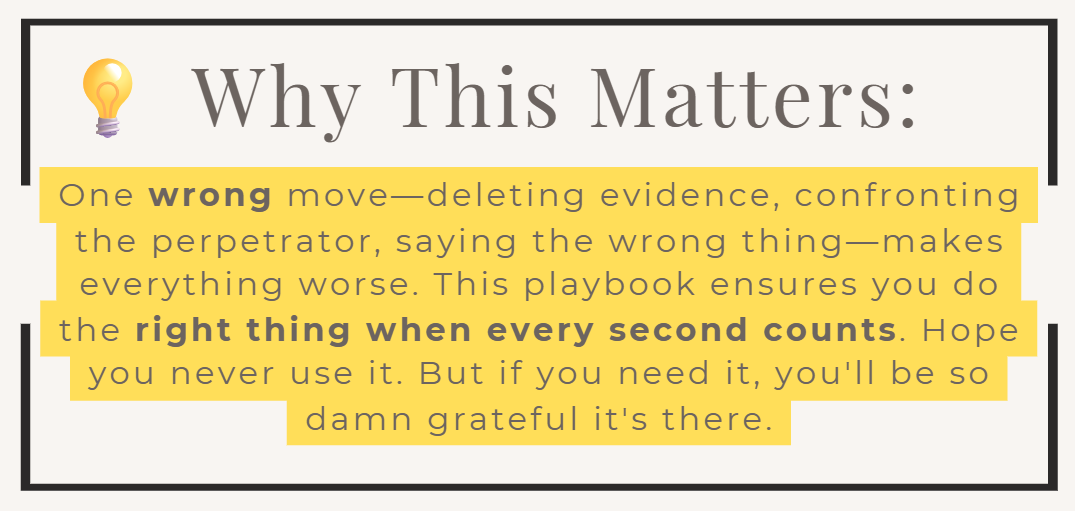 I hope you never need this. But if your kid comes to you in tears, if you find something on their phone, if they're in immediate danger—you need to know EXACTLY what to do in the first 60 seconds. Not Google it. Not freeze. This playbook tells you exactly what to do, who to call, and what to say.