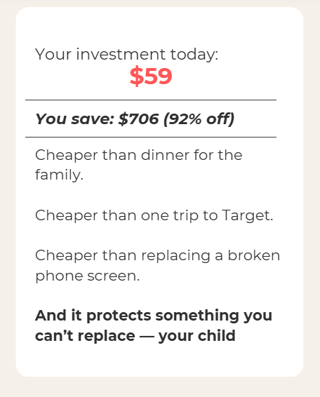 $47 is less than: - Your monthly streaming subscriptions - A decent pair of shoes - Dinner and a movie for two - Two weeks of coffee shop runs You wouldn't hesitate to spend that on entertainment. Why would you hesitate to spend it on your child's safety? Priorities, right?